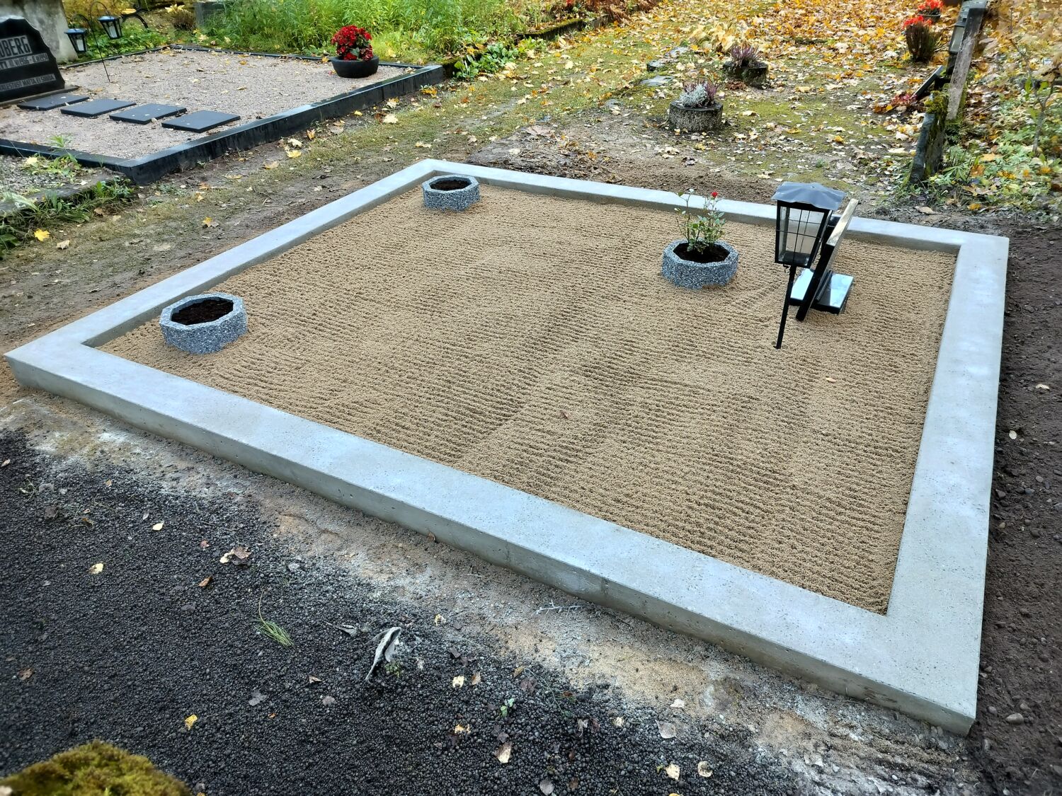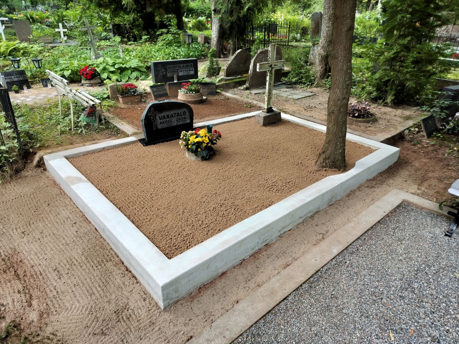 Betoonist valatud hauapiire tavalaiuses 17cm. Kõrgus sõltub eelkõige naaberplatsidest ja vajaminevast kõrgusest, kuid vähemalt 20cm kõrge.